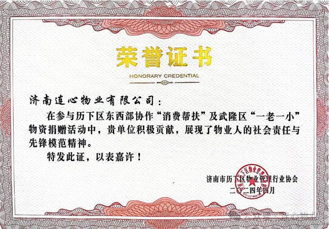 濟南連心物業(yè)有限公司榮獲歷下區物業(yè)管理行業(yè)協(xié)會(huì )“優(yōu)秀會(huì )員單位”“歷下區東西部協(xié)作會(huì )員單位”等榮譽(yù)稱(chēng)號。