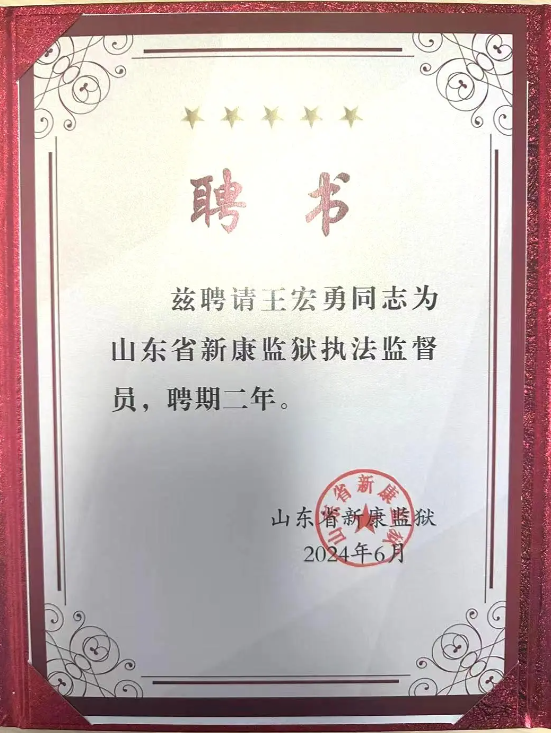 王宏勇同志被聘為“山東新康監獄執法監督員”