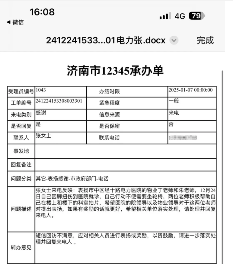 事情發(fā)生在2024年12月24日,張女士因腳扭傷前往山東電力中心醫院就診。由于傷勢導致行動(dòng)不便,她需要借助輪椅才能在醫院內移動(dòng)。丁志源和朱升榮得知張女士的情況后,全程積極協(xié)助樓上樓下科室拍片檢查。他們用貼心周到的服務(wù),為張女士的就診提供全程幫助,讓她感受到醫院就診時(shí)的溫暖與關(guān)懷。為表達感謝,張女士撥打12345市民熱線(xiàn),希望通過(guò)山東電力中心醫院和連心物業(yè)公司的領(lǐng)導對這兩位保安老師給予表揚,以示對他們工作的肯定和鼓勵。