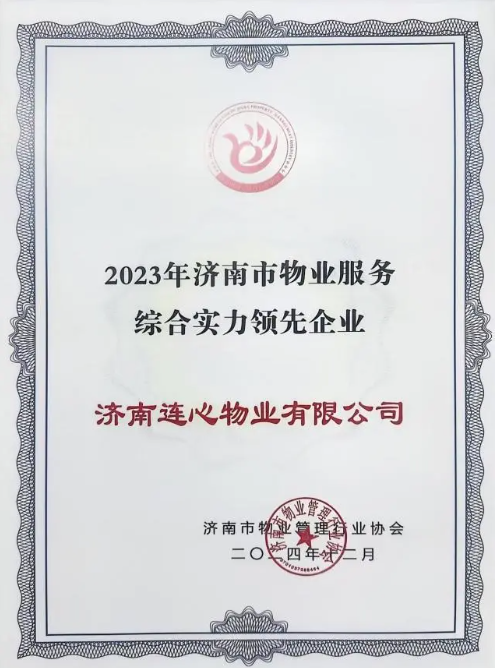 濟南連心物業(yè)有限公司榮獲“濟南市物業(yè)服務(wù)綜合實(shí)力領(lǐng)先企業(yè)”、“2024年度金牌會(huì )員單位”、山東電力中心醫院項目獲“2024年度物業(yè)服務(wù)標準化等級評定4A級”等榮譽(yù)稱(chēng)號。