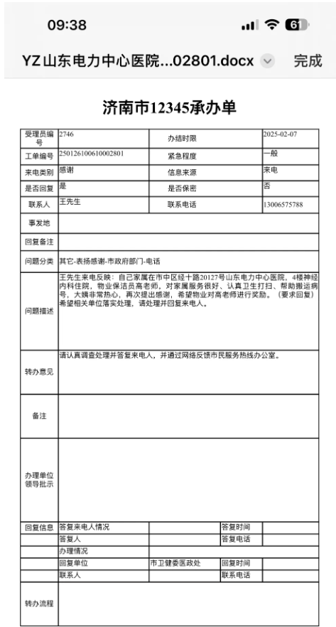 2025年1月27日,濟南連心物業(yè)有限公司駐山東電力中心醫院項目收到12345表?yè)P電話(huà),市民王先生通過(guò)撥打12345市民熱線(xiàn),對公司駐山東電力中心醫院項目保潔員高桂萍表達誠摯的感謝。