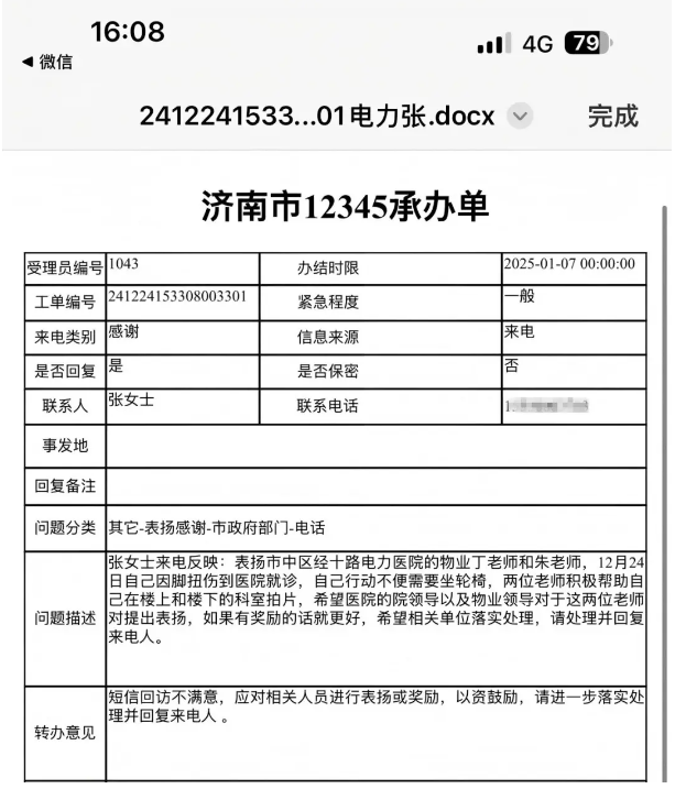 他們的熱心與周到,讓受傷的張女士在病痛中感受到山東電力中心醫院滿(mǎn)滿(mǎn)的關(guān)懷。這份溫暖深深感動(dòng)了張女士,撥打12345市民熱線(xiàn),對山東電力中心醫院和兩位保安表達誠摯的感謝。這一暖心事件,并非偶然。