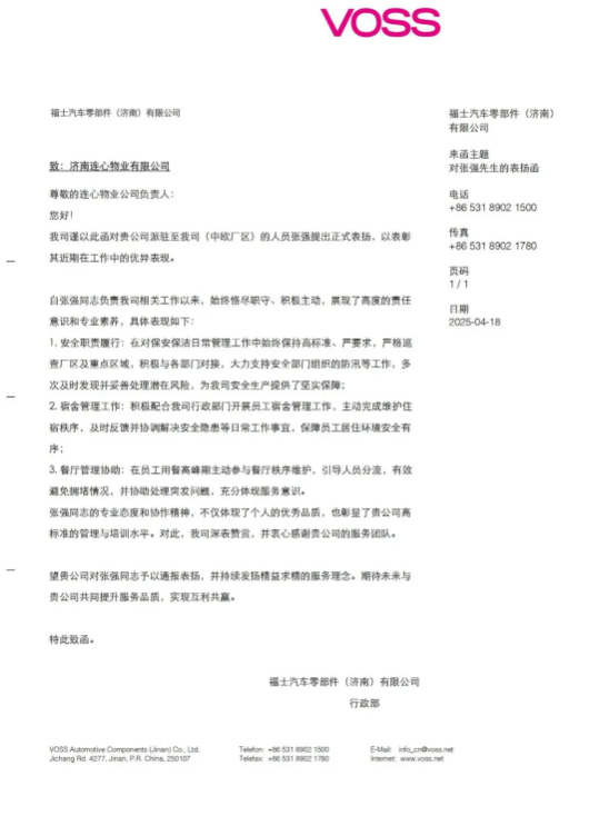 2025年4月18日,濟南連心物業(yè)有限公司收到來(lái)自福士汽車(chē)零部件(濟南)有限公司的表?yè)P函,對濟南連心物業(yè)有限公司駐福士汽車(chē)零部件(濟南)有限公司中歐廠(chǎng)區項目部員工張強同志在工作中優(yōu)異表現給予高度贊揚。此次表?yè)P不僅是對員工個(gè)人的肯定,更是對連心物業(yè)服務(wù)品質(zhì)的充分認可。