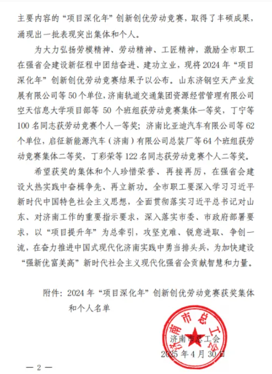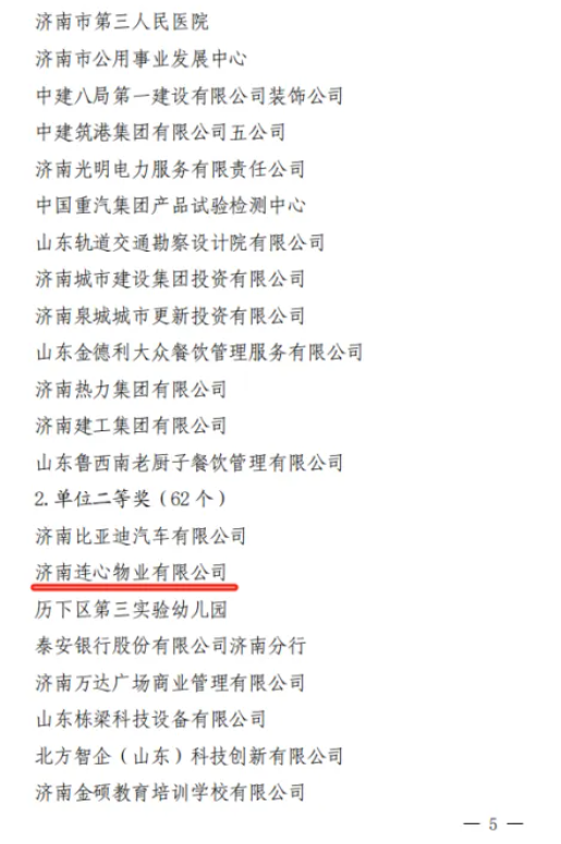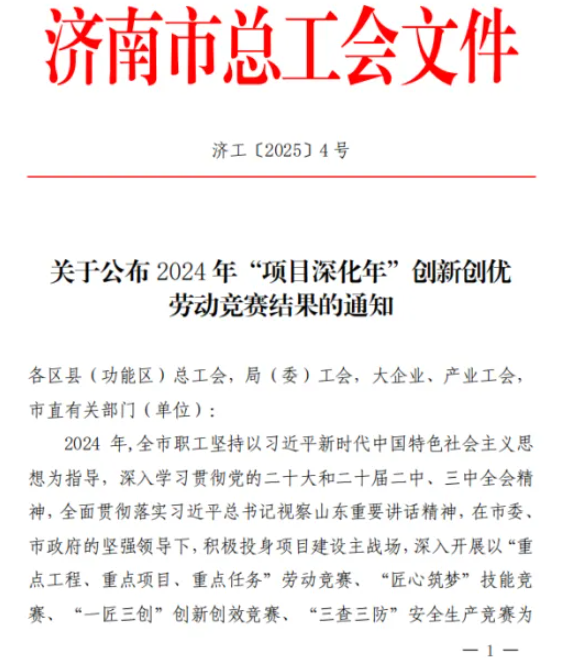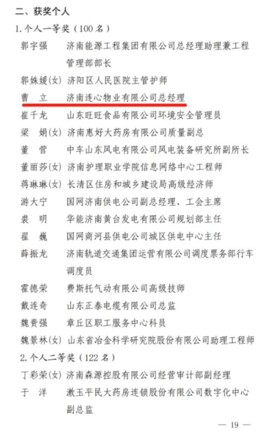 2025年4月30日,濟南市總工會(huì )發(fā)布《關(guān)于公布 2024 年“項目深化年”創(chuàng )新創(chuàng )優(yōu)勞動(dòng)競賽結果的通知》,濟南連心物業(yè)有限公司榮獲創(chuàng )新創(chuàng )優(yōu)單位二等獎,黨支部副書(shū)記、總經(jīng)理曹立榮獲個(gè)人一等獎。