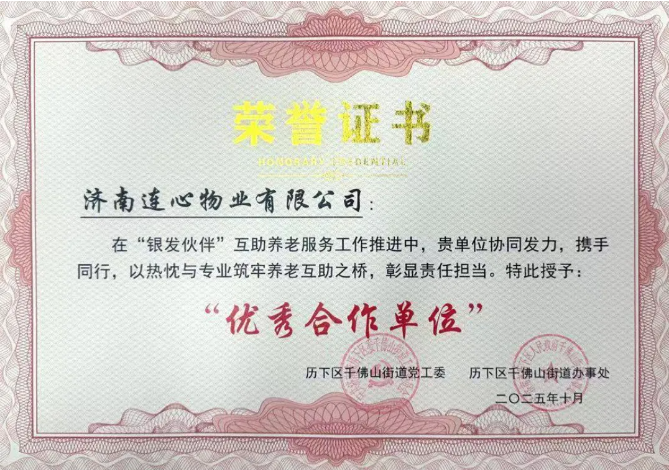 此次獲評“優(yōu)秀合作單位”是對濟(jì)南連心物業(yè)社會責(zé)任擔(dān)當(dāng)與務(wù)實(shí)精神的高度認(rèn)可。作為“銀發(fā)伙伴”項目的重要參與力量,連心物業(yè)充分發(fā)揮服務(wù)專業(yè)的優(yōu)勢,積極整合資源、搭建互助平臺、組織為老活動,切實(shí)筑牢社區(qū)養(yǎng)老互助橋梁,助力該模式持續(xù)走深走實(shí),推動養(yǎng)老事業(yè)與產(chǎn)業(yè)協(xié)同發(fā)展。