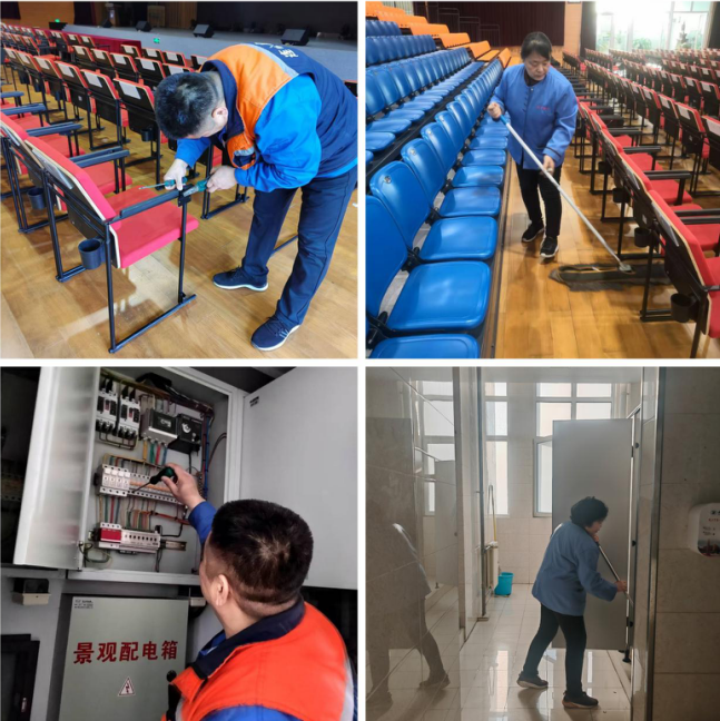為確保戲劇節(jié)活動(dòng)場(chǎng)地及校園公共區(qū)域環(huán)境整潔有序,項(xiàng)目部提前部署工作。項(xiàng)目保潔團(tuán)隊(duì)對(duì)學(xué)校禮堂進(jìn)行全方位清潔,從座椅縫隙、地面污漬到舞臺(tái)周邊、玻璃門(mén)窗,逐一細(xì)致擦拭、拖掃,不放過(guò)任何衛(wèi)生死角,校園內(nèi)道路、宣傳欄等區(qū)域也同步開(kāi)展深度保潔,保潔人員手持清掃工具對(duì)路面雜物、宣傳欄積塵進(jìn)行徹底清理,讓校園環(huán)境煥然一新。在設(shè)施保障方面,項(xiàng)目維修團(tuán)隊(duì)提前排查電路線路、檢修座椅穩(wěn)固性,對(duì)發(fā)現(xiàn)的細(xì)微故障及時(shí)處理,確?;顒?dòng)期間各類(lèi)設(shè)施設(shè)備正常運(yùn)行,從硬件層面為戲劇節(jié)筑牢安全防線。項(xiàng)目會(huì)務(wù)服務(wù)人員全程跟進(jìn)保障工作。提前對(duì)主席臺(tái)進(jìn)行標(biāo)準(zhǔn)化布置,全面消毒清洗并精準(zhǔn)擺放茶具、飲用水等;活動(dòng)期間隨時(shí)待命,及時(shí)響應(yīng)會(huì)場(chǎng)各類(lèi)服務(wù)需求,以貼心、規(guī)范會(huì)務(wù)服務(wù),為活動(dòng)順利開(kāi)展提供有力支撐。