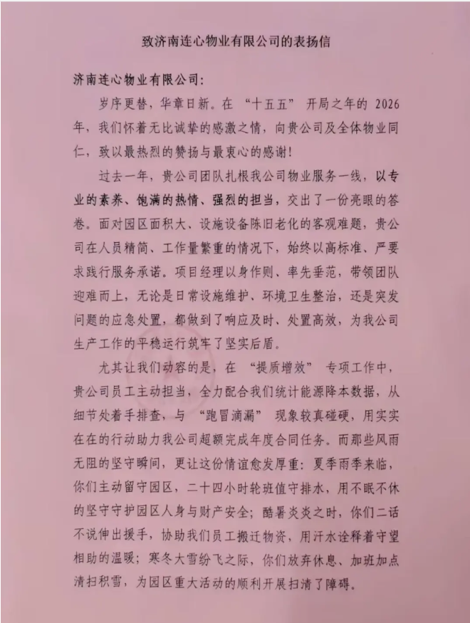 2026年2月1日,濟(jì)南連心物業(yè)有限公司收到一封來自山東輸變電設(shè)備有限公司表揚信,對連心物業(yè)過去一年的工作、服務(wù)品質(zhì)、團(tuán)隊素養(yǎng)與擔(dān)當(dāng)精神給予高度評價與認(rèn)可。