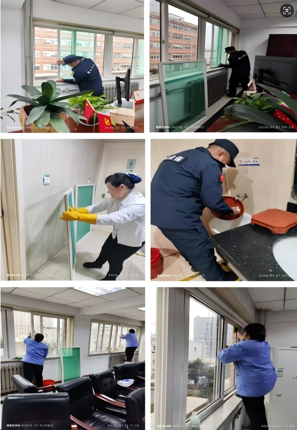 項(xiàng)目部周密部署,集中開展“擦亮窗口、潔凈辦公”深度清潔。針對(duì)20余間辦公室玻璃、窗框及窗紗,工作人員嚴(yán)格遵循“清塵、去污、提亮”標(biāo)準(zhǔn)化流程作業(yè),確保清潔效果達(dá)到無塵、無漬、無痕標(biāo)準(zhǔn)。煥然一新的辦公環(huán)境既掃去舊歲塵埃,更映照新春氣象。