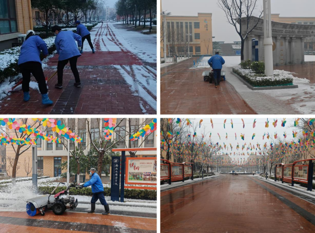 雪情即命令。清晨天剛蒙蒙亮,物業(yè)員工已手持工具奮戰(zhàn)在清雪一線。大家不畏嚴(yán)寒、分工協(xié)作,有的揮舞掃帚清掃路面積雪,有的手持推雪板清理主干道,還有的操作掃雪機(jī)高效推進(jìn)。在大家共同努力下,原本被積雪覆蓋的校園道路逐漸露出原貌。