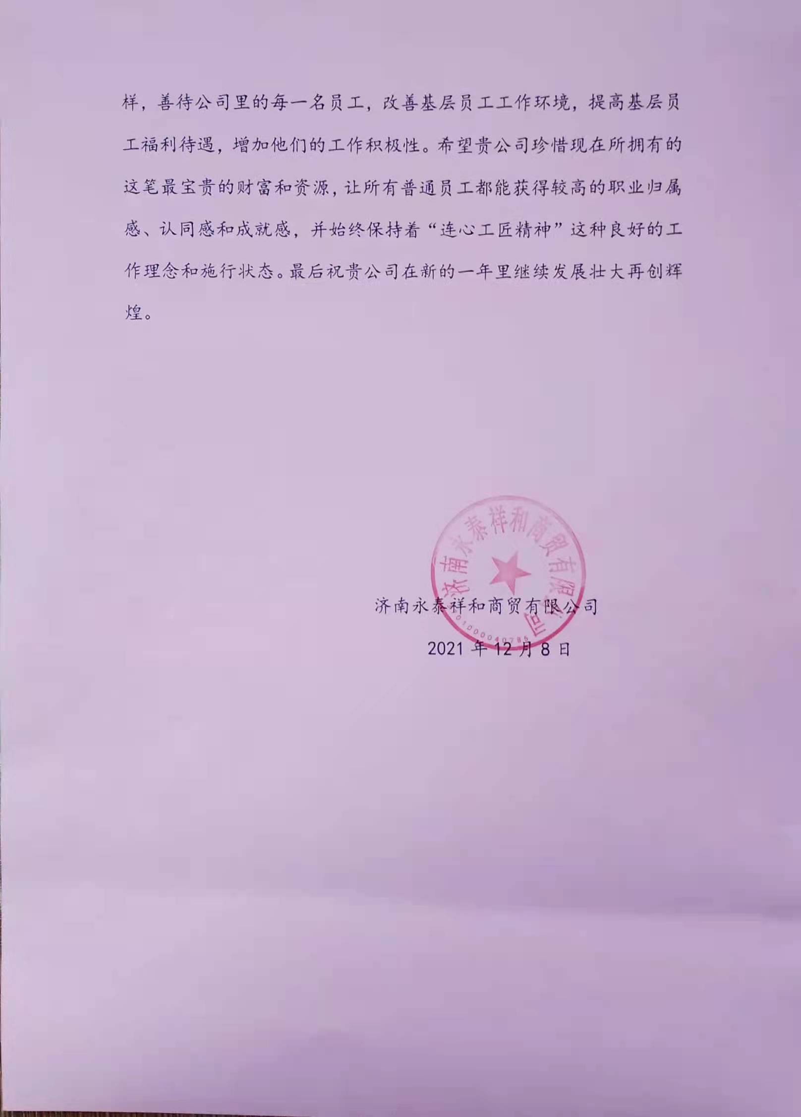 2021年12月8日,濟南連心物業(yè)有限公司收到一封來(lái)自濟南永泰祥和商貿有限公司業(yè)主的表?yè)P信。信中表?yè)P了保潔部朱玉基、高振玲兩位同志認真工作、熱情服務(wù)的工作情況,展示了連心物業(yè)基層員工良好精神面貌,踐行著(zhù)“連心工匠精神”的服務(wù)理念,讓“選擇了連心就選擇了放心”更加深入人心。