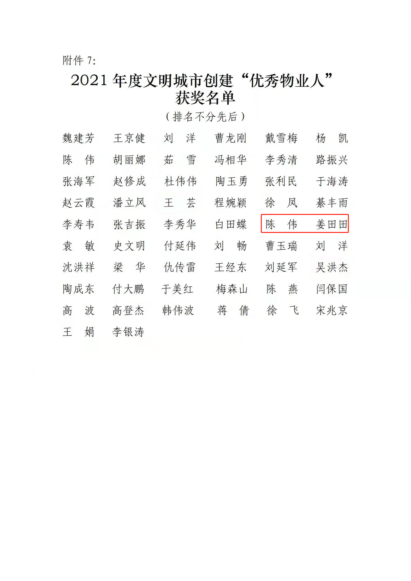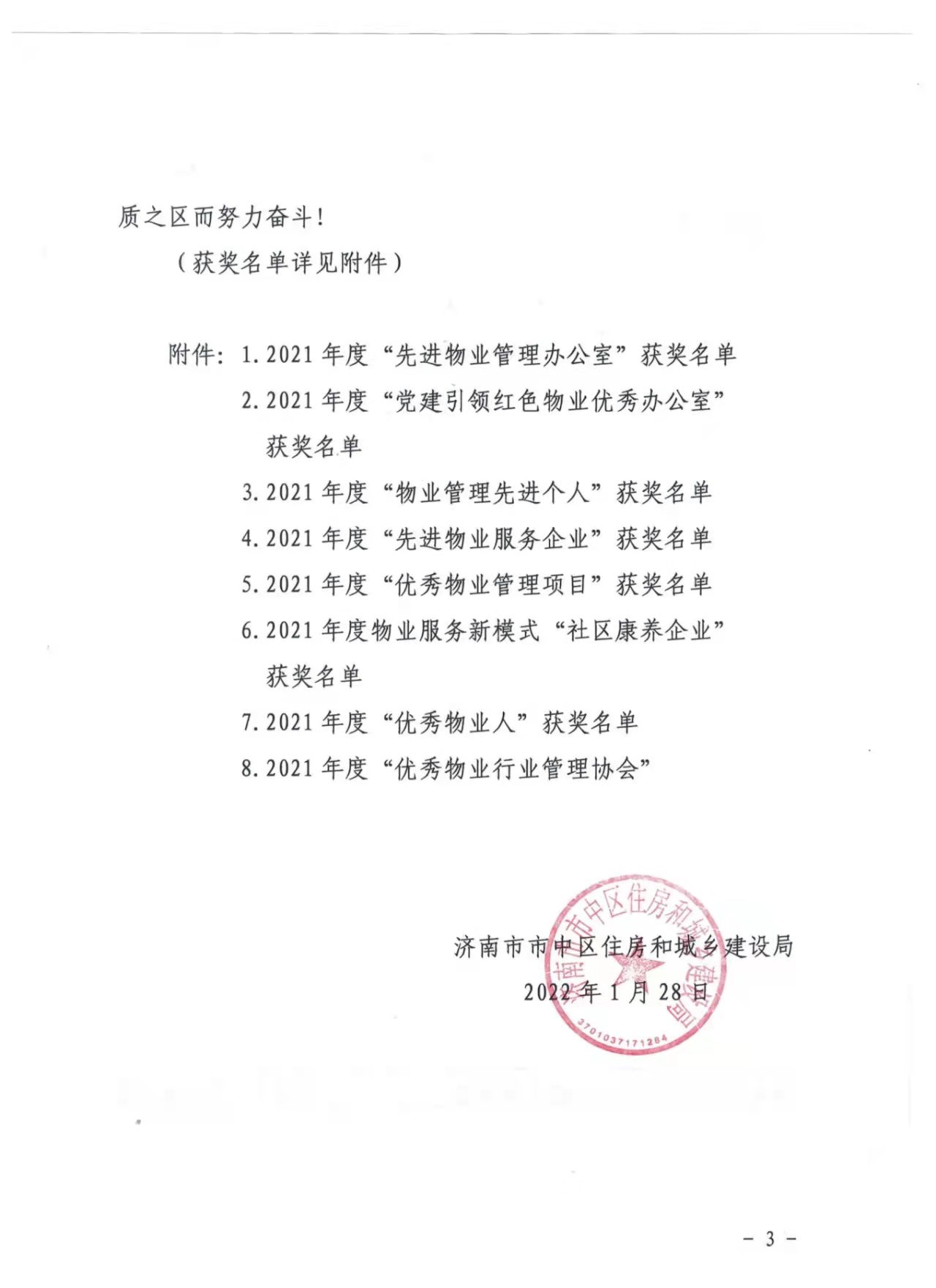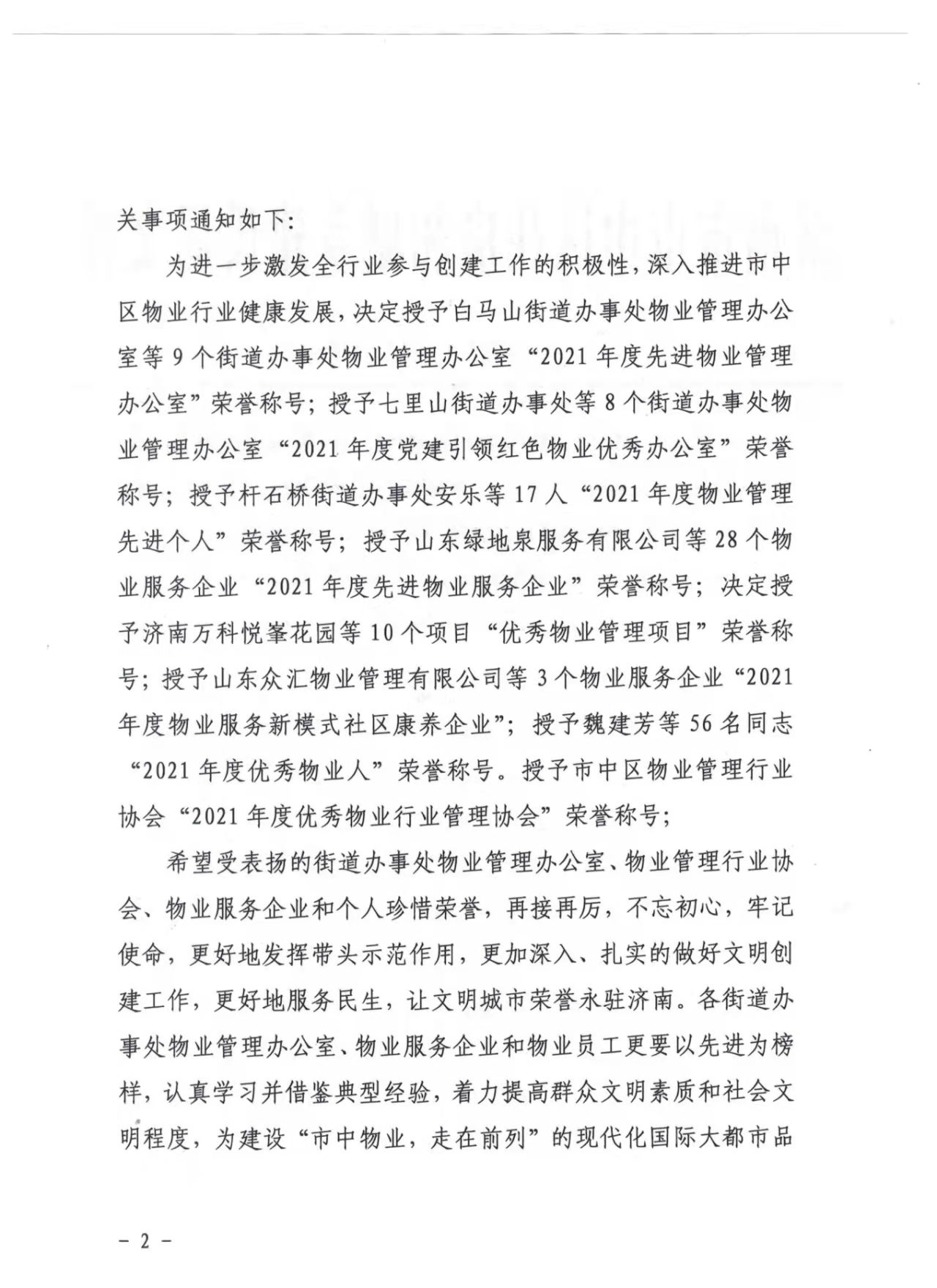 2022年1月,濟南市市中區住房和城鄉建設局表彰了連心物業(yè)陳偉、姜田田在內的56名“2021年度優(yōu)秀物業(yè)人”。在2021年全區文明城市創(chuàng )建、疫情防控、“泉城紅色物業(yè)”工作推進(jìn)以來(lái),在公司總部的領(lǐng)導下,兩名同志緊緊圍繞各項指標要求,組織有力、成績(jì)突出、勇挑重擔、甘于奉獻,全身心投入到各項工作中,在平凡的崗位上做出了不平凡的業(yè)績(jì)。