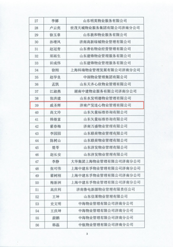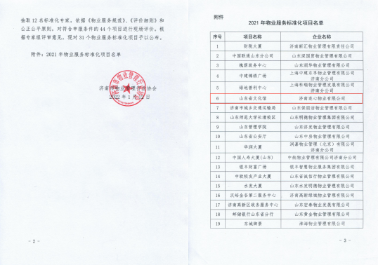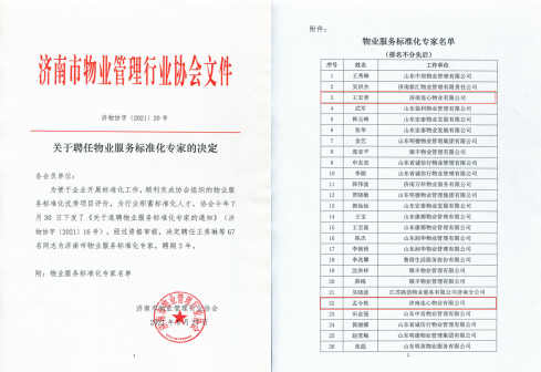 為便于企業(yè)開(kāi)展標準化工作,鼓勵物業(yè)服務(wù)企業(yè)重視標準化工作,不斷提升員工業(yè)務(wù)服務(wù)技能,為廣大業(yè)主提供專(zhuān)業(yè)、規范、高效的物業(yè)服務(wù),濟南市物業(yè)管理行業(yè)協(xié)會(huì )開(kāi)展了《關(guān)于開(kāi)展2021年度物業(yè)服務(wù)標準化項目評價(jià)的通知》,連心物業(yè)駐山東省文化館項目被評為物業(yè)服務(wù)標準化項目。根據《關(guān)于選聘物業(yè)服務(wù)標準化專(zhuān)家的通知》(濟物協(xié)字〔2021〕16號),經(jīng)過(guò)資格審查,最終聘任連心物業(yè)王宏勇、孟令乾,產(chǎn)發(fā)連心物業(yè)戚圣輝等67名同志為濟南市物業(yè)服務(wù)標準化專(zhuān)家,聘期3年。