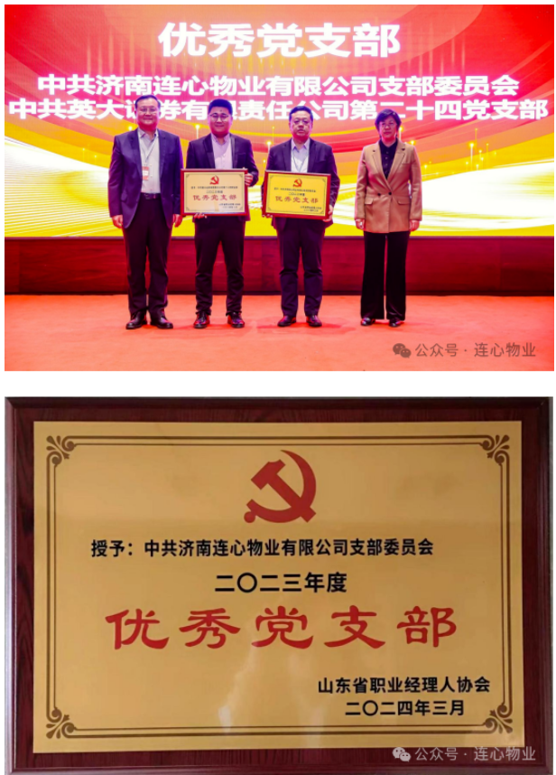 2024年3月14日下午,山東省職業(yè)經(jīng)理人協(xié)會(huì )“龍首啟航 繁花璀璨”年度盛會(huì )在濟南高新子曰·美秀酒店一樓子悅宴會(huì )廳舉行。濟南連心物業(yè)有限公司黨支部榮獲“2023年度優(yōu)秀黨支部”榮譽(yù)稱(chēng)號。