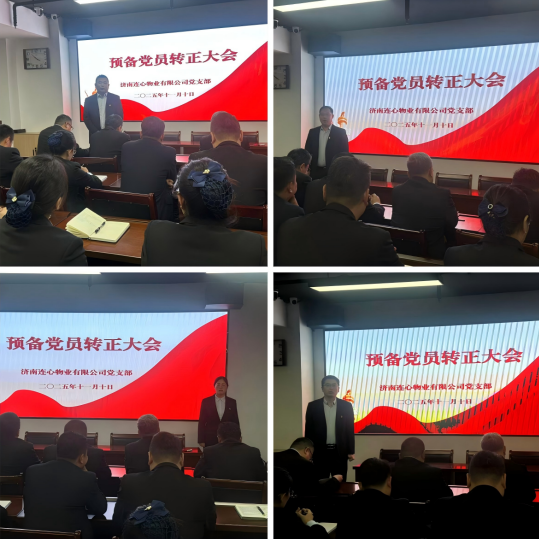 2025年11月10日下午,濟(jì)南連心物業(yè)有限公司黨支部在1701會(huì)議室召開第四季度黨員大會(huì),公司全體黨員、入黨積極分子及遞交入黨申請書人員48人參加本次大會(huì)。學(xué)習(xí)黨的二十屆四中全會(huì)精神、審議預(yù)備黨員轉(zhuǎn)正事宜等兩項(xiàng)議程。