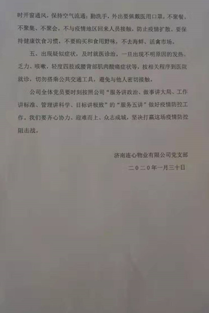 2020年春節假期以來(lái),面對日益嚴峻的新型冠狀病毒感染的肺炎疫情防控形勢,濟南連心物業(yè)有限公司黨支部書(shū)記、董事長(cháng)王宏勇要求公司廣大黨員在防控新型冠狀病毒感染肺炎疫情面前,積極發(fā)揮先鋒模范作用,為堅決打贏(yíng)疫情防控阻擊戰提供堅強的組織保障。